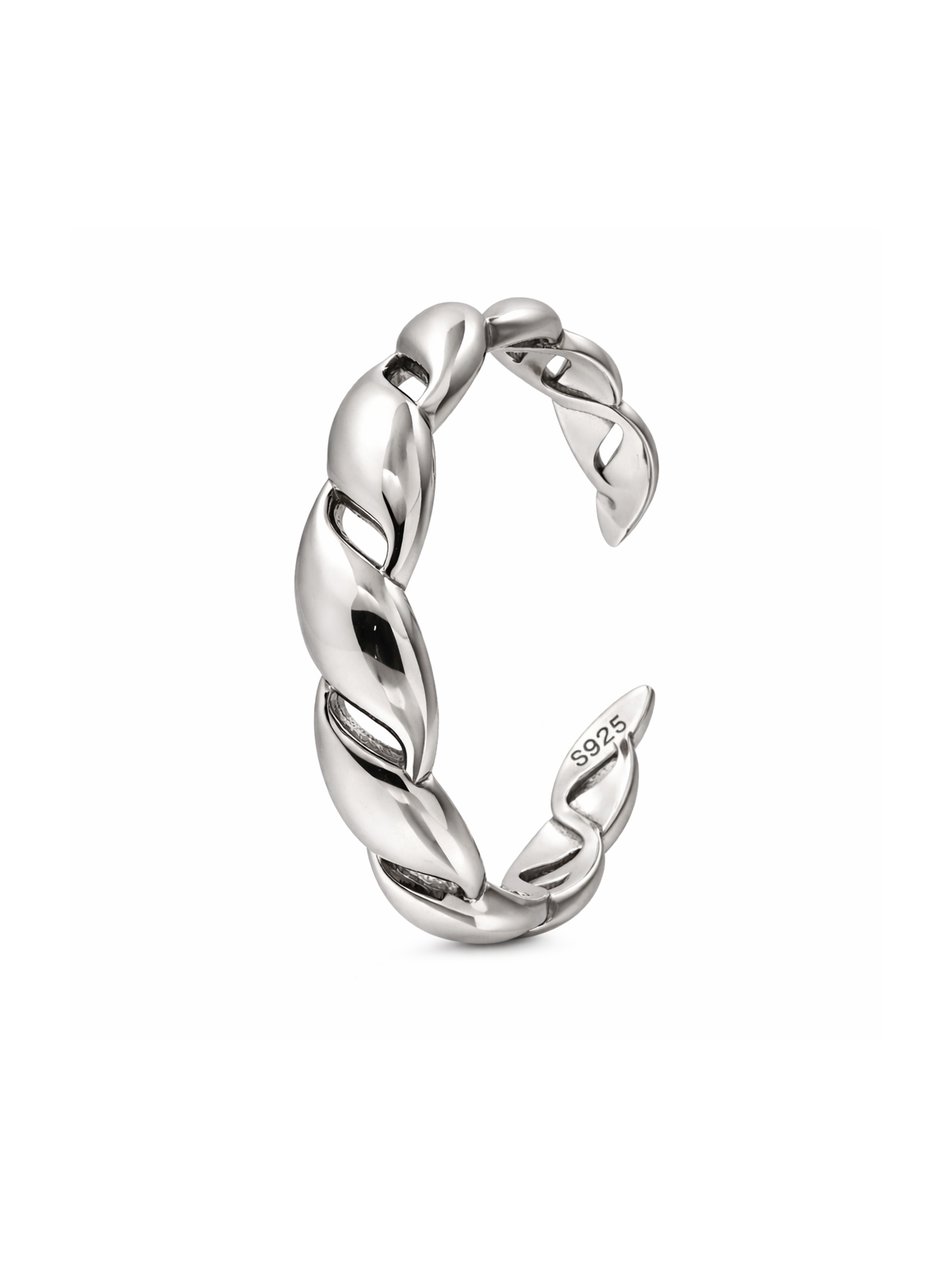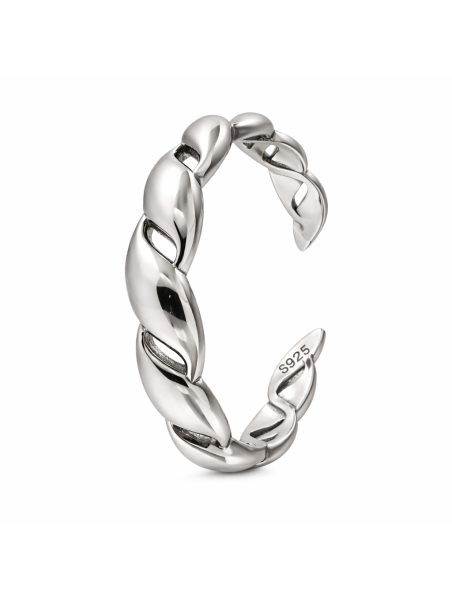 Anillo fabricado en plata de ley 925 con un diseño contemporáneo inspirado en la forma de eslabones entrelazados. Su acabado pulido de alto brillo resalta la forma curva de cada pieza, creando una joya elegante y llamativa.