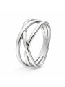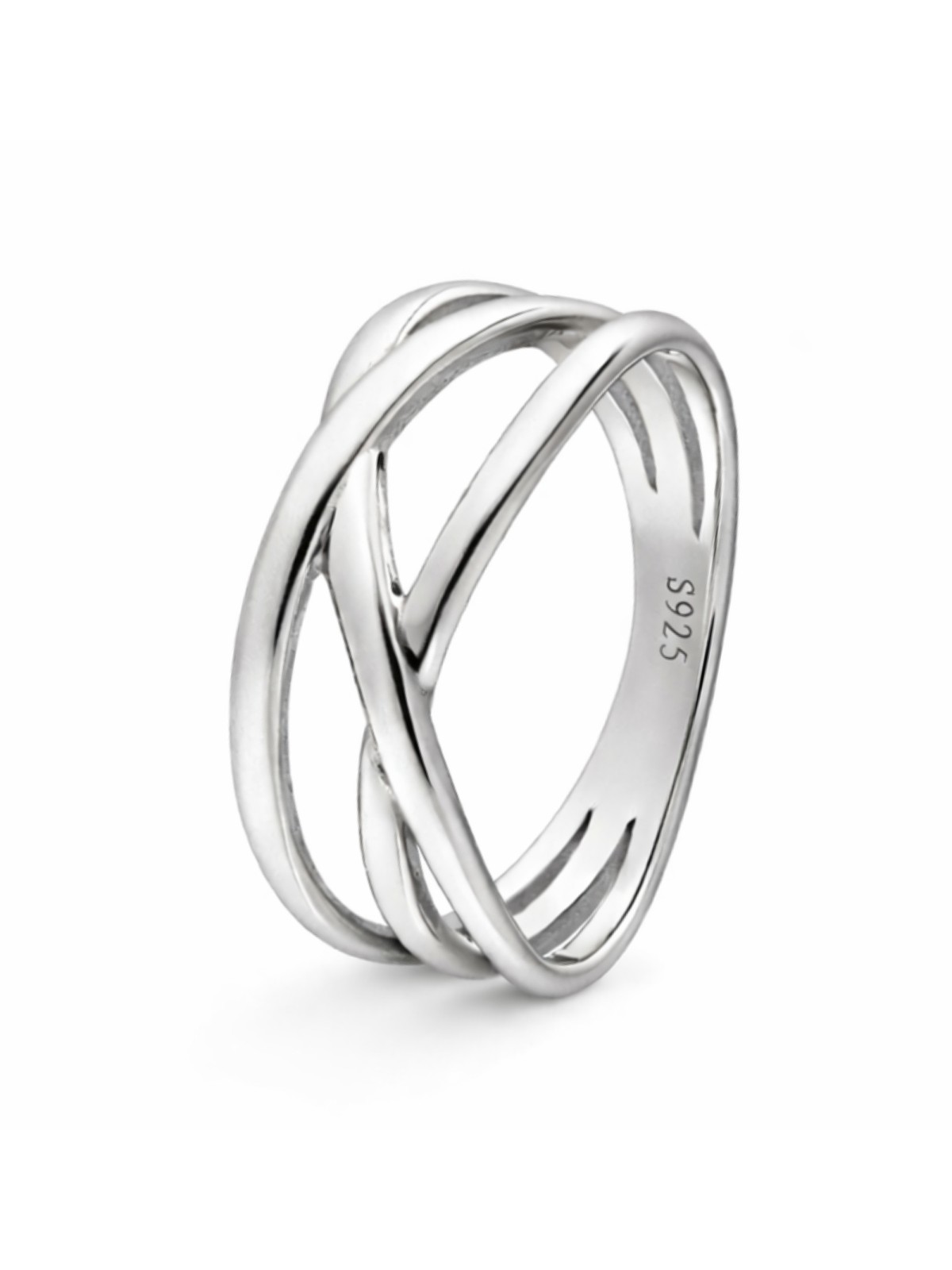 Este anillo está elaborado en plata de ley 925 y presenta un diseño de líneas cruzadas entrelazadas, creando un efecto visual dinámico y contemporáneo. Sus bandas suaves y pulidas se entrecruzan formando una estructura elegante que aporta profundidad y movimiento a la joya.