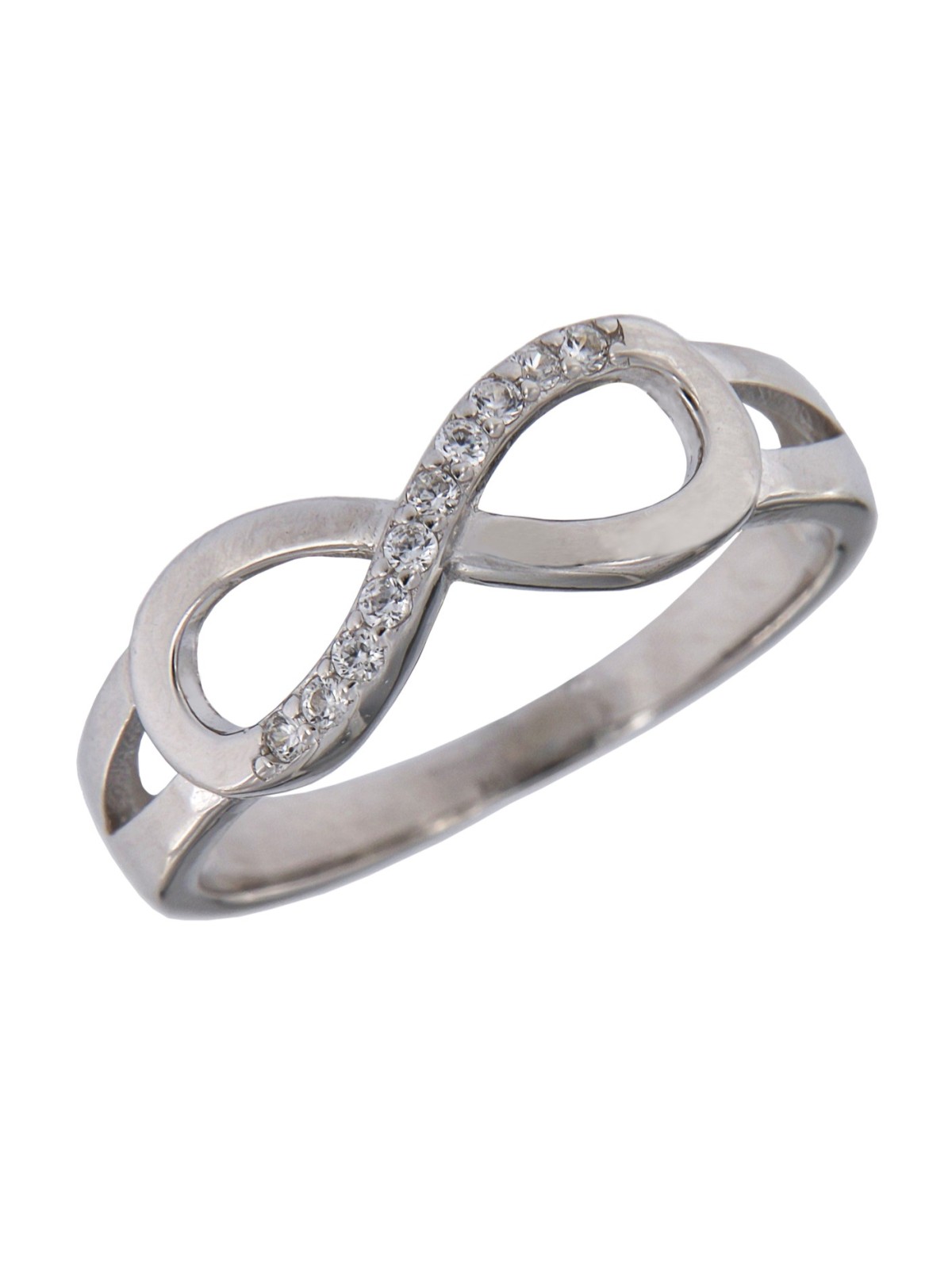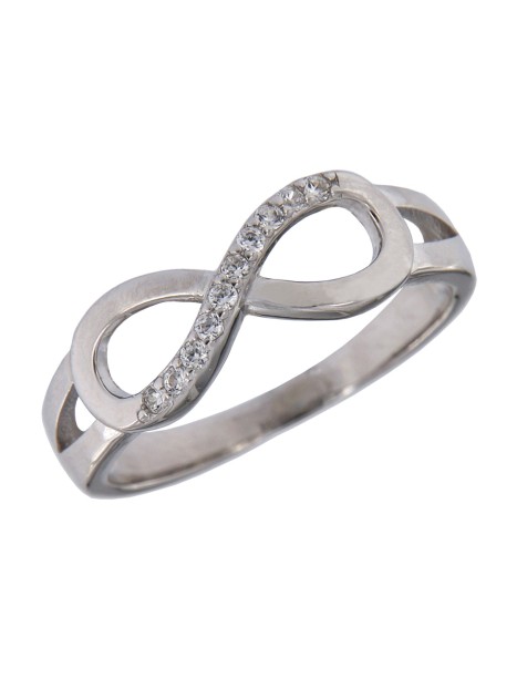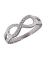 Anillo en forma de infinito combinada una parte lisa con otra parte decorado con circonitas blancas en su interior.