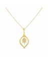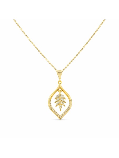Colgante dorado inspirado en la naturaleza con diseño de hoja y circonitas brillantes.