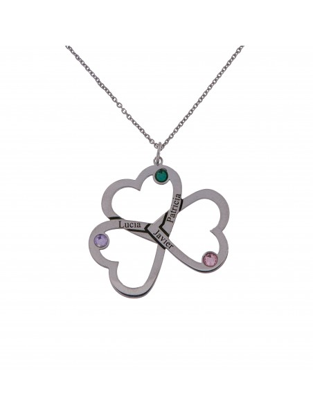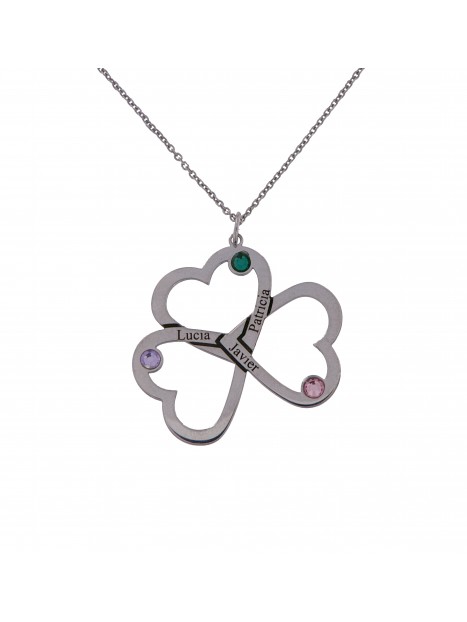 Regala cariño y buena fortuna a tus seres queridos con este colgante de plata personalizable de tres corazones, colocados en forma de trébol. Con la opción de personalizarlo con tres nombres que se grabarán con una cuidadosa atención al detalle, este colgante será una muestra única y exclusiva de tu afecto.