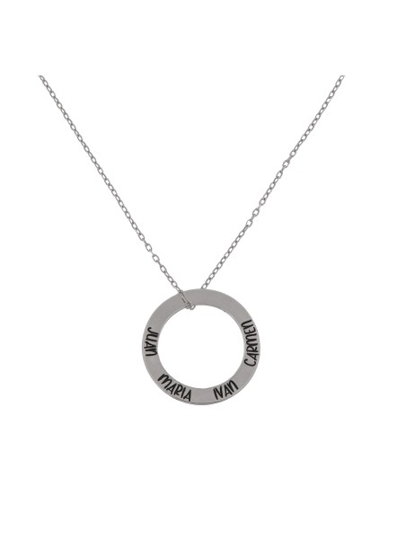 Colgante en forma de aro con nombres grabados alrededor. Su forma circular, sin principio ni fin, evoca conexión eterna y convierte esta pieza en una joya cargada de significado personal.